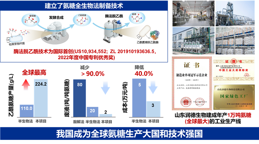 面向人民生命健康,开发氨糖全生物法制备关键技术。合作企业山东润德生物建成年产1万吨(全球最大)氨糖的生产线,企业获“制造业单项冠军示范企业”和“中国工业大奖表彰奖”,使我国成为全球氨糖生产大国和技术强国。